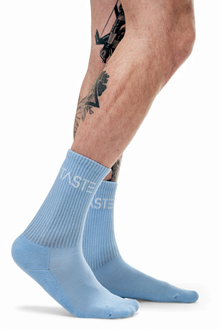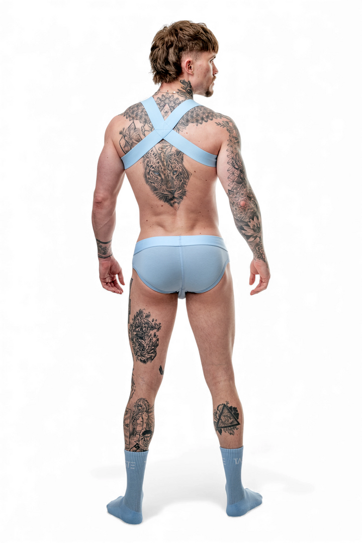 - Matching Candy Blue Socks: Complete the look with our comfortable, sporty socks designed to match the briefs and harness perfectly. These socks add the finishing touch to your coordinated outfit, offering both style and practicality.