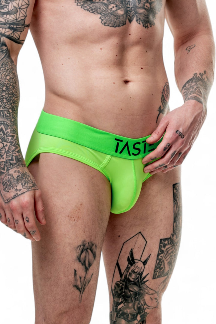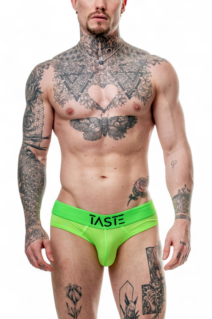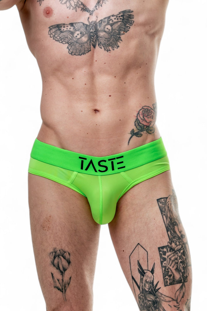Crafted with precision in Europe, the Neon Green Briefs are made from high-quality, breathable fabric that feels just as good as it looks. The stretchy, form-fitting design hugs your body in all the right places, enhancing your natural physique while providing ultimate comfort. The striking neon green colour grabs attention, while the bold “TASTE” logo across the waistband adds an extra punch of personality and attitude.