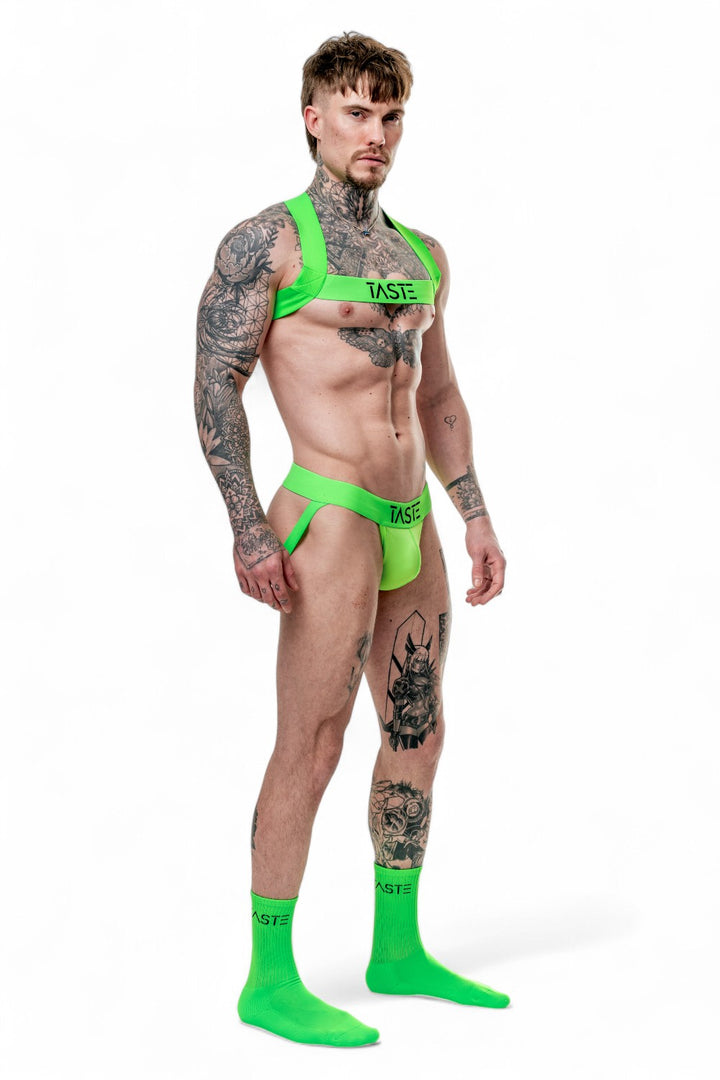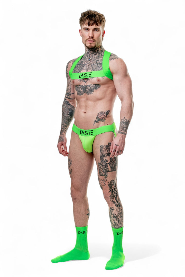 The Neon Green Chest Harness is designed to make you feel unstoppable. The elastic straps fit snugly and comfortably to your body, highlighting your physique while providing the support you need. The striking neon green colour pops, and the bold “TASTE” logo across the chest adds a confident edge to the design. The criss-cross back ensures extra support while adding that little bit of extra flair. Available in sizes XS to XXL, this harness fits and flatters every body type, giving you a bold look that commands attention.