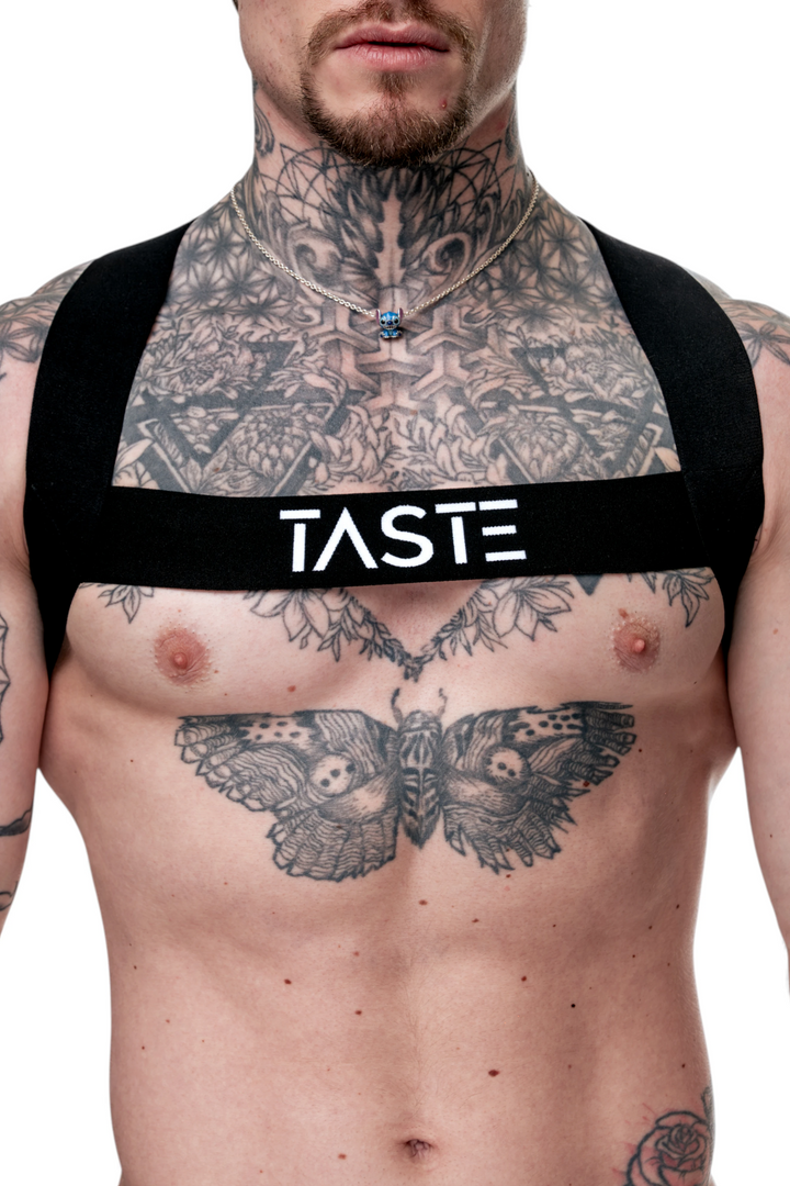 - Signature Black Harness: Elevate your look with this bold, structured harness, complete with the TASTE logo prominently displayed across the chest. It's the perfect accessory to add that sexy, confident touch.